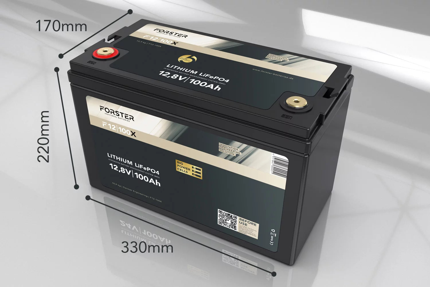 Forster 12,8V Lithium 100Ah LiFePO4 Premium Batterie | 200A-BMS-2.0 | 1280Wh | IP67