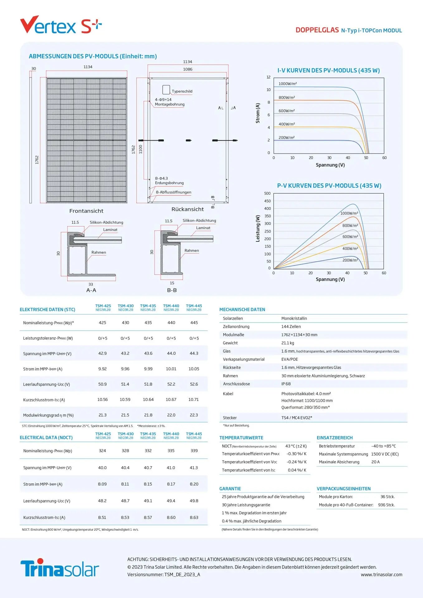 36x Trina Solar 445W Vertex S+ Doppelglas N-Type TopCon Solarmodul